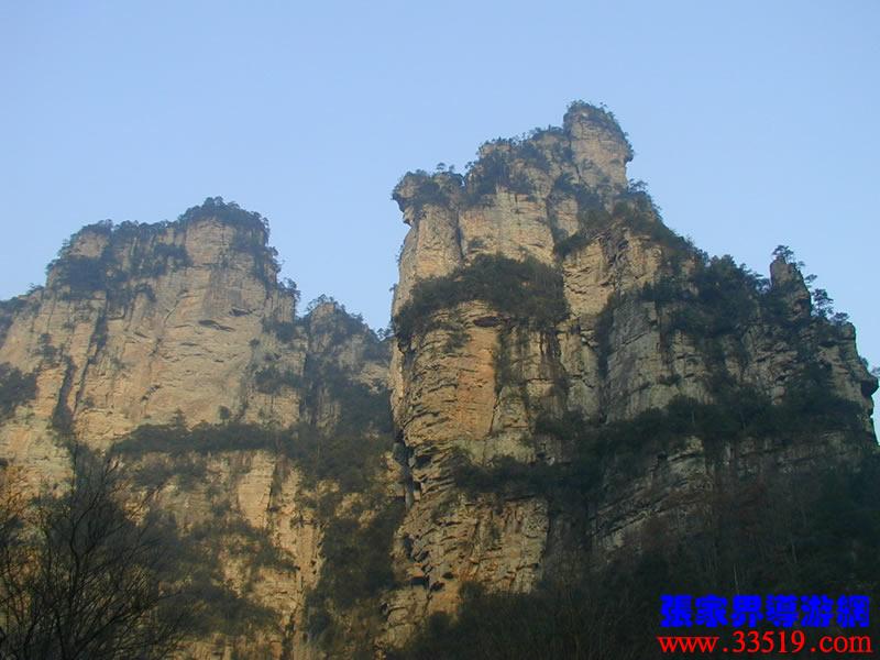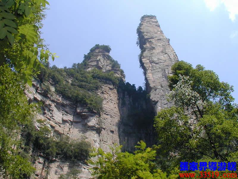 (金鞭巖、神鷹護鞭)如果要問張家界國家森林公園的標志景點,答案是現成的:金鞭巖。早在清代中期,一些文人就把張家界的峰林及百丈峽列入“永定八景”。其一叫“危峽啼猿”;其二叫“層巖涌塔”:“縣西二十里青崖山,其前五山并立,層峙如浮圖。中一峰更峻拔,上插宵漢,晴輝雪積,最擅奇觀。”這里說的“其中一峰”,指的金鞭巖。八大景點張家界占其二,可見先人是有眼力的。金鞭巖相對高度380多米,拔地而起,直插云霄,無論你遠看近看,正看側看,都是一根刺破青天的長鞭!在金鞭巖左側的那座巖峰,大家看多像一只兇猛的老鷹,勾嘴瞪眼,雙翅略展,時刻警覺地守護著金鞭,人稱“神鷹護鞭”。