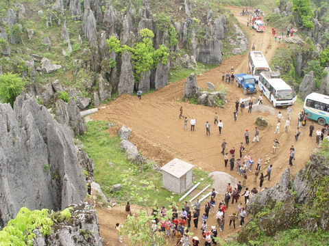 登上洛塔,只見連山綿谷,萬石如林,一塊塊青灰色的大石頭競高競秀,競美競奇,綿亙縱橫,層疊交錯,造型奇特,塔狀、蓮臺狀、羅漢狀、錐狀、刀狀、箭簇狀、帷幕狀等林立薈萃,像一個個神奇的迷宮,組成洛塔地質(zhì)公園的旖旎景觀。有的玲瓏斫剔,若女繡工鐫;有的嶙峋怪異,如鬼斧神鑿;有的崢嶸巉峻,似水墨丹青;有的嵯峨兀立,藤蔓纏繞,更像一株株挺拔的古樹。高的、矮的、大的,細的。粗、瘦、皺、滑,各具特色,如人之面目相具而無一相似者,在綠樹紅花間亮麗起一道道迷人的風景。洛塔石林遍及整個山界,較集中的有楠竹車水坪石林、梭洛趙家灣石林、八仙石林及公路沿線的銀河塔石林,僅車水坪一帶的石林面積就達1000多畝。無論其規(guī)模面積,造型及組合情況,洛塔石林都可與云南石林媲美。