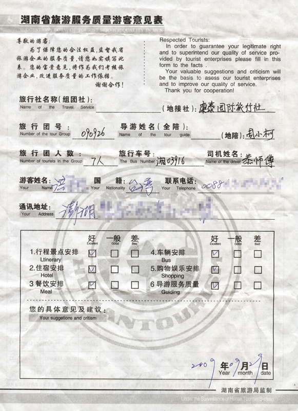 9月26日臺(tái)灣李洪先生一行7人接待質(zhì)量反饋單: