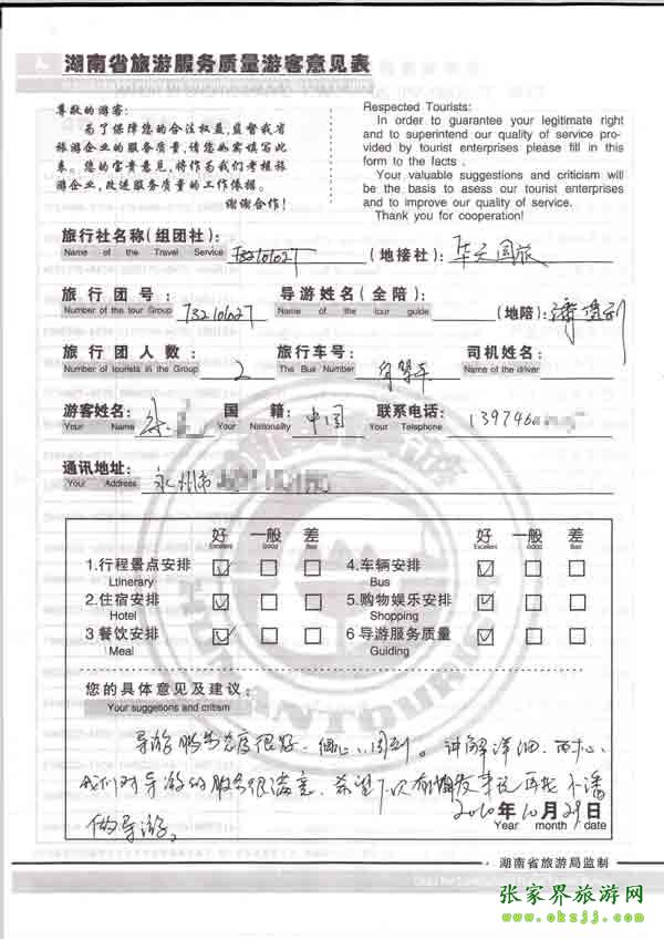 2010年10月29號(hào)永州朱先生一行兩位旅游質(zhì)量反饋:對(duì)導(dǎo)游很滿意,下次來還找她