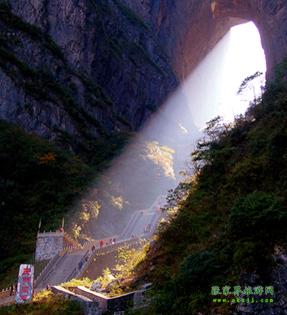 中國(guó)最高的自然“天門(mén)洞” 公元263年即三國(guó)吳永安永安六年時(shí),吳王孫休見(jiàn)其高峻雄偉,巍峨壯觀(guān),便將武陵郡分置天門(mén)郡,從此天門(mén)冊(cè)名傳遐邇,譽(yù)貫古今。天門(mén)洞周?chē)赜恐ぴ?,老僧、玉壺、玉堂、金匱、筆架、將軍、箭桿、漆圓、弩牙、猿點(diǎn)、天姥、負(fù)兒、簸箕、雞籠、高遠(yuǎn)等16座山峰,其間又鑲嵌著雷、電、風(fēng)、云、泥、蛇、龜、祖師、玉皇、鬼谷、果老、玄天、合山、求兒、鐘鼓、老龍等16洞府,幽默盤(pán)亙,使得天門(mén)山在雄偉之中又增添了神奇和秀麗。流水清洌的澧河為天門(mén)山頻映倒影,寬廣低平的田疇為其鋪就如茵綠毯,繁茂的森林裝點(diǎn)著山基和山頂,淡云薄霧為她峨冠霞佩,朝暉夕照為她斜染紅裝。隨著四季的更替,她春茵夏碧秋金冬縞,呈現(xiàn)出無(wú)窮的變幻。天門(mén)山生態(tài)系統(tǒng)給天門(mén)洞的神奇增添了新的魅力。 據(jù)說(shuō),天門(mén)洞開(kāi)景區(qū)的有上天梯。有著九百九十九級(jí)臺(tái)階的上天梯!