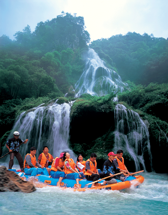 第四天,清晨我們便踏上了汽車去看漂流。號稱亞洲第一大的九天果然是名不虛傳,我們把它現(xiàn)在開發(fā)的部分粗略的走了一下,就花了我們近月4個小時,中鐘乳石遍地,在五彩斑闌的燈光下,顯得晶瑩剔透,閃閃發(fā)光,讓人感覺到是到了水晶宮一般,地下還有陰河,遠(yuǎn)處通知海(據(jù)說)。對了,中溫度很低,常年在10多度。讓人在其中感覺到一陣陣寒意。故想進(jìn)去的朋友記得多穿點(diǎn)衣服,以免著涼,切記。我們當(dāng)時就是吃了很大的虧,從中出來時,小嵐就在點(diǎn)喀漱。下午來到茅巖河漂流。上船前看到有人賣水瓢,心中不免奇怪。雖說,張家界金鞭溪的水可以喝,但也不是每一條河的水都能喝?。坑谑巧锨叭?,一打聽才知道,這瓢不是用來舀水喝的,而是用來打水仗的。本來因?yàn)樾褂悬c(diǎn)小感冒,我們打算保持中立,但一看到各位船友們個個磨拳擦掌,人手一把瓢或者水槍(這是當(dāng)?shù)厝擞弥褡幼龅囊环N土水槍),還且對我們是虎視眈眈,我想我參加是不成了。于是我們也花了幾塊錢買了兩把。船開動后,大家開始時還是比較興奮,不時用瓢來劃一下船,但是沒多久,大家就開始尋找新的開心方式了,于是大家都開始蠢蠢欲動了,大家也都不客氣,不管別人是否作好應(yīng)戰(zhàn)準(zhǔn)備,反正是先下手為強(qiáng),其中一條船首先開火,于是大家都沒有在乎什么了,見著在自己的攻擊范圍內(nèi)的非本船的人員都拿來作為自己的攻擊目標(biāo)。于是一時峰煙四起,水花四濺,幾乎看不清別人了,反正是嘴不能張,不然很容易被別人灌進(jìn)水去。每條船都選了一名成員為隊(duì)長,我們這組的一位北京的朋友自告奮勇的成為了我們的隊(duì)長。于是大家都聽他的指揮。大家同舟共濟(jì),萬眾一心。雖說不時遭到攻擊,但是大家都有happy得不行。一時休戰(zhàn),再經(jīng)過幾個灘后,大家再戰(zhàn)。這次,大家不再是沒有目的的攻擊,幾個隊(duì)長經(jīng)過商量后,大家結(jié)成聯(lián)盟,一起對付那條仗著自己全是男子漢的最猛的船。。。。。。結(jié)果是將那條船上的兩個“猛男”給潑到船下去了。不過船是橡皮做的,有驚無險。結(jié)果是到了終點(diǎn)后,每個人都成了水人。不過大家都happy的不得了。下午,漂流公司的車送我們到市內(nèi)。不幸的是,小嵐因上午著涼,下午又淋水,結(jié)果感冒了。彭導(dǎo)是早已等到汽車站了。我們又去吃了點(diǎn)東西。